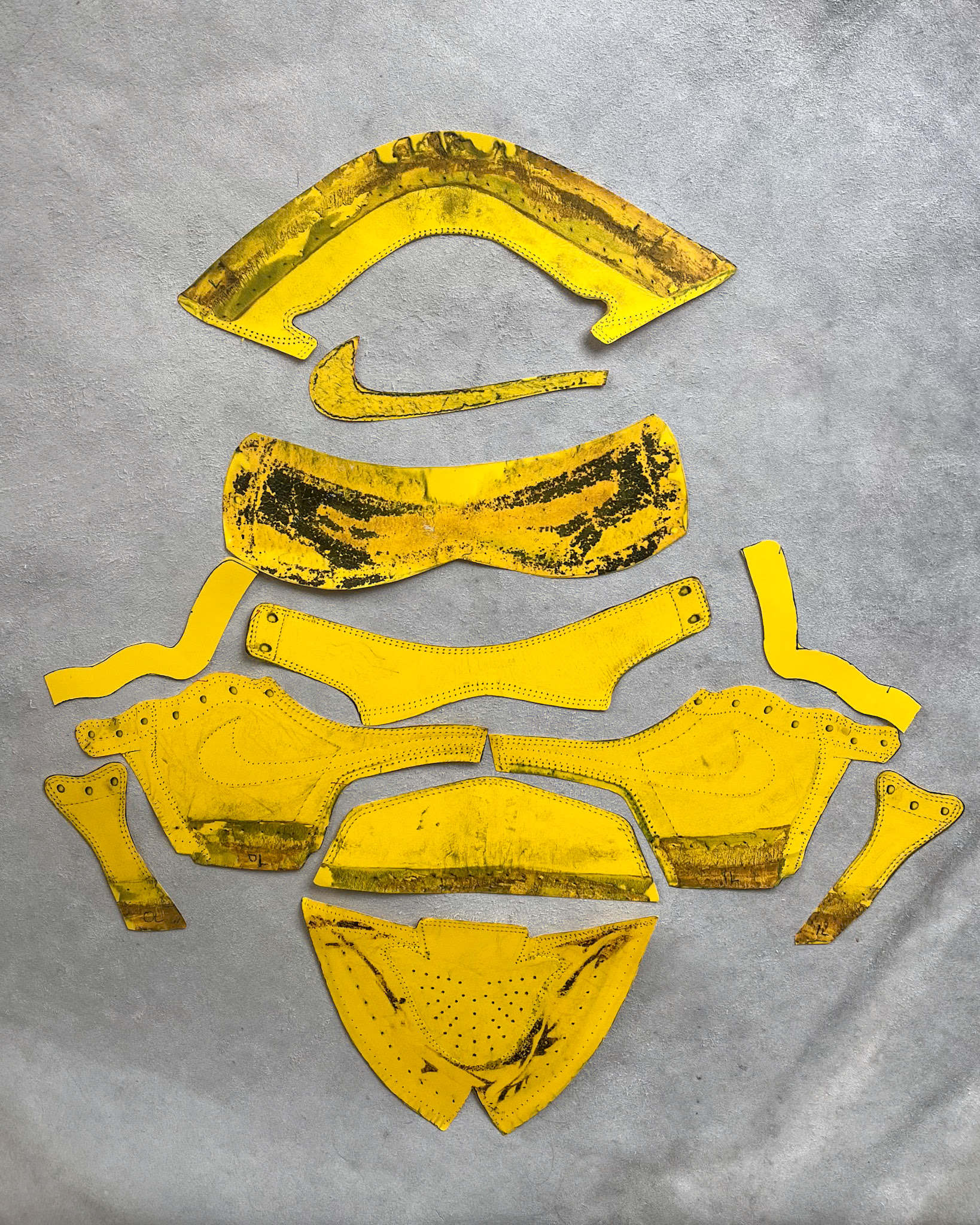 I started by tracing the pattern onto the leather and cutting out each panel with a sharp pair of shears. A blade can also work, but I found it left a less consistent edge than the scissors. With each panel of the shoe cut out, I proceeded to skive the ends of certain panels to reduce thickness during assembly. I then prepped the pieces for painting with isopropyl alcohol. For my first shoe, I went with a black and white colorway, which simplified the paint-mixing process significantly. I used 3-4 coats of Angelis leather paint along with one coat of gloss finish, all applied via airbrush.