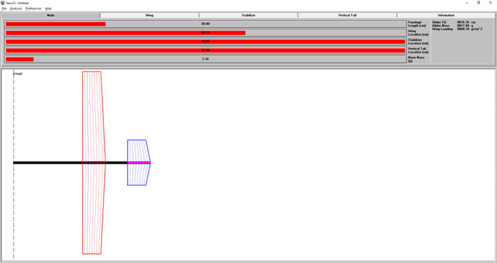 Wing shape and placement were the next considerations. After spending some becoming familiar with the Aery software, I noticed there were some preset designs that Aery provided, a few of which employed the Canard style design, with the horizontal stabilizer in the front of the aircraft and the wing further aft. Other possibilities included a centralized wing, or wings that were slightly offset due to variations in the center of mass. For the wing shape, options included a straight wing, tapered wing, and swept wing. A dihedral was also considered to add horizontal stability. Other options to achieve a similar result included winglets well as fixed ailerons to trim out the aircraft.