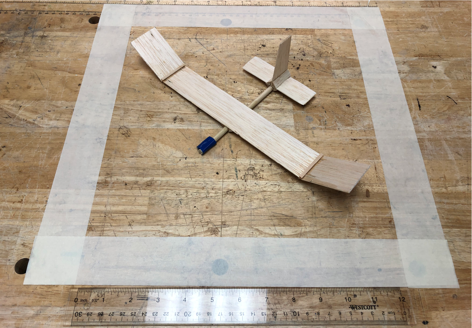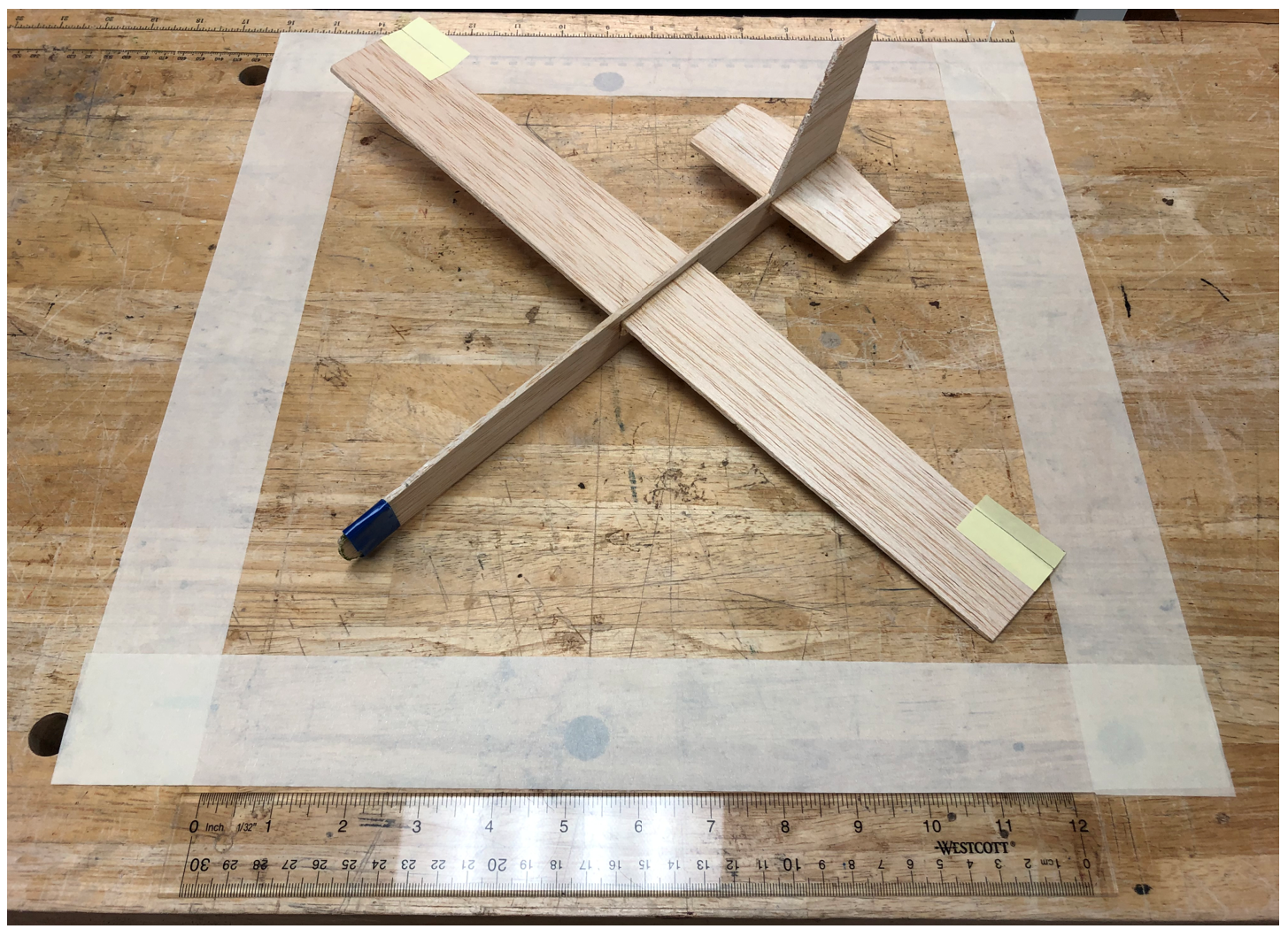 Before making my test flights, I balanced my glider according to Aery’s suggestions. My initial design had a nose weight of about 4 grams. I used a small lead weight and fastened it to the nose using electrical tape. Once my glider was balanced, I began test flights.