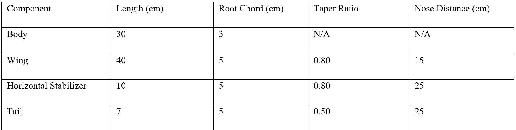 I utilized Aery to yield a theoretical value for the aircraft's center of gravity, and I balanced the glider on a needle to find the actual CG. The theoretical value suggested by Aery came out to 16.26 cm from the nose, while the experimental value was very close to that at an approximate 16.1 cm. As for the mass of the entire glider, the mass proposed by Aery came out to 17.84 g, while the actual mass was about 18 g.