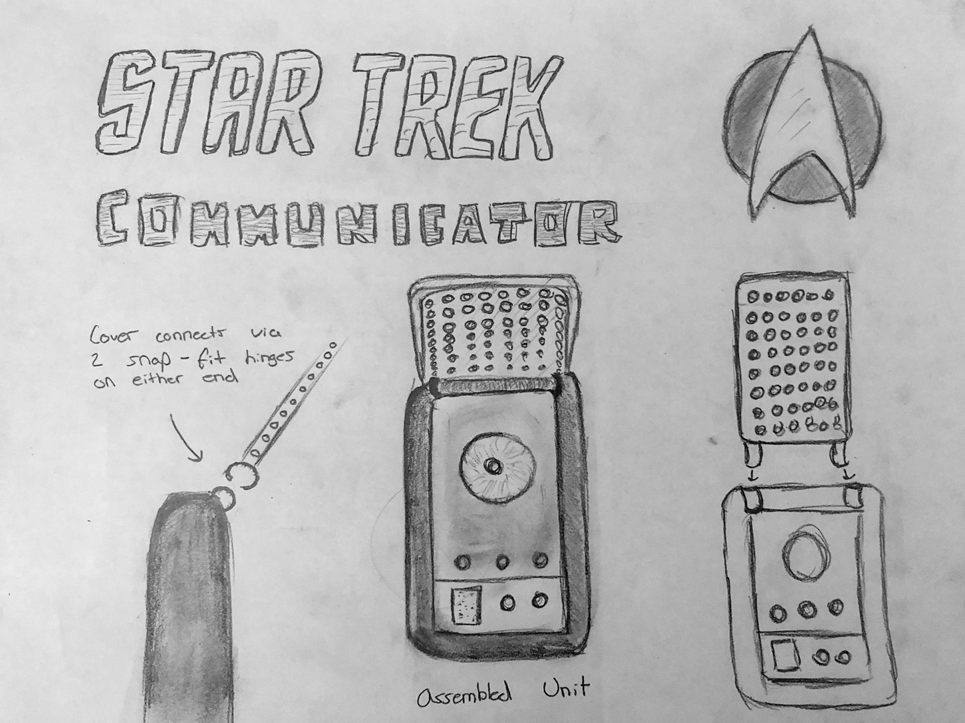 Starting off with a few simple sketches of basic design ideas, my design process took off rather quickly after I decided to pursue the Star Trek Communicator. After drawing up a few more detailed views of the object, I dove straight into Solidworks. I began with a basic rectangular design which later evolved into a tapered body to portray the real prop more accurately. I was pleased that the parts still connected without snapping or breaking, despite not working completely as intended.