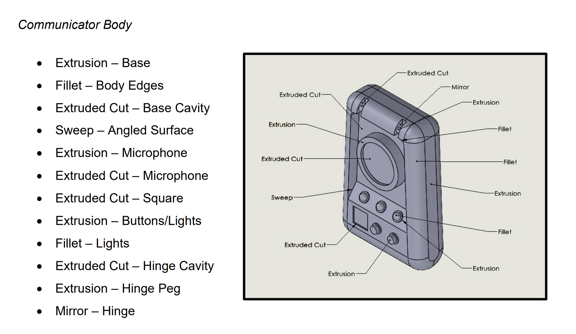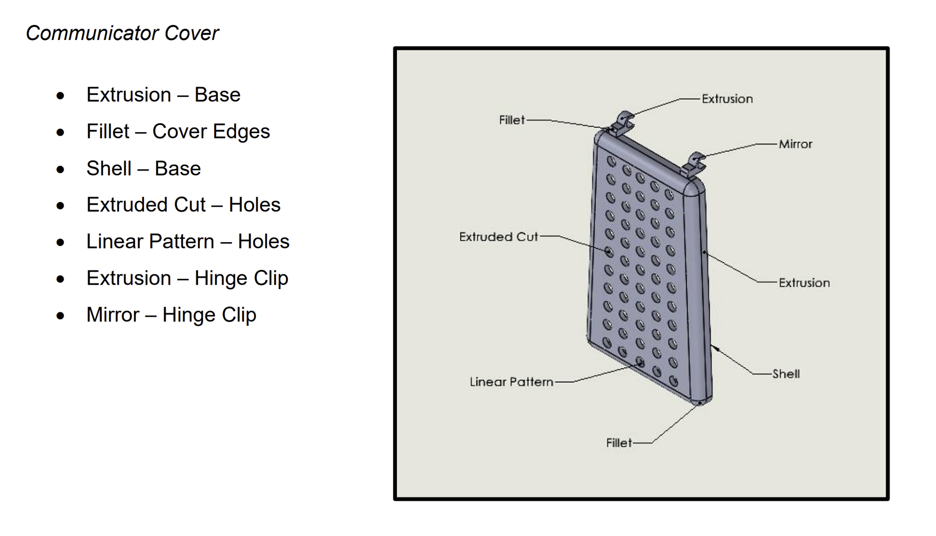 The only interlocking feature present within my design is the hinge mechanism that connects the body to the cover at the top of the Communicator. On the cover, there are two small clips that snap onto the pegs present on the body. The design was mainly inspired by the hinge present on the actual Communicator. The features themselves were straightforward to design – the main concern was making sure the cover could open and close to be flush with the body.