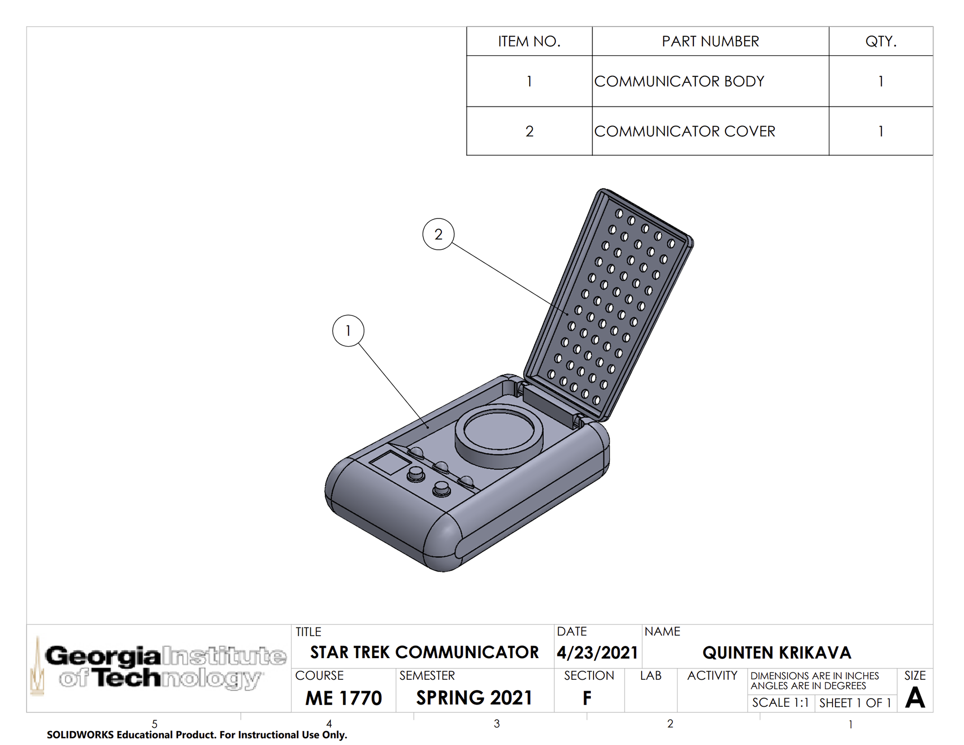 For this project, we were tasked with designing a small object to be 3D printed on the EOS Formiga 110. The basic project requirements were that the object had to be worked on individually and had to consist of 2-4 interlocking parts, each fitting within a 3 inch cube for a total volume of no more than 4 cubic inches. I eventually decided to pursue the Star Trek Communicator - my two other initial ideas being a set of measuring spoons as well as a mountable cellphone holder. While the other two ideas may have been more functional, I chose to continue with the Communicator as it seemed like the most unique out of the three with the most potential for different CAD features. Not to mention I am a huge Star Trek fan. My initial design was composed of two components, the body and cover, connecting via two basic snap-hinges. Due to the size constraints of the project, I scaled down the design quite a bit such that the entire assembly fit within the 4 cubic inch volume. I considered breaking each component into two separate pieces which could be later assembled into the full-scale Communicator but decided against such to reduce the complexity of what I thought was already a fairly ambitious design. The finished part is my own creation, pulling inspiration from images of the props used in the films and TV shows, with a few alterations to the shape to make it more unique.