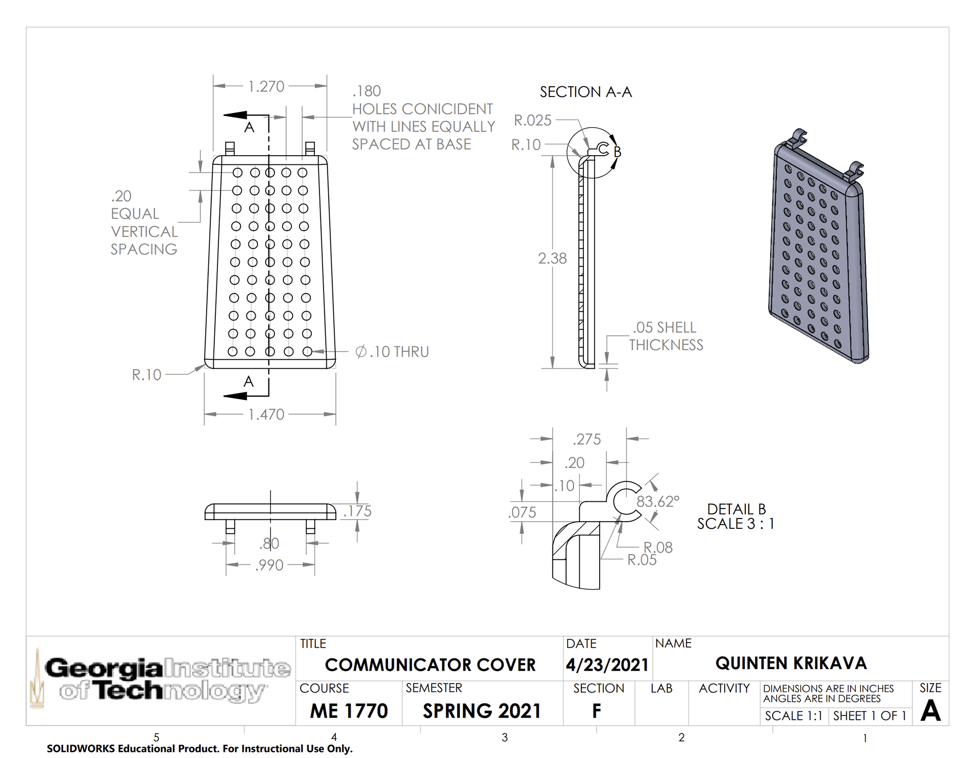 This was my first time using the Formiga printer, and as such I came out the other side with a few lessons learned. One being to always keep in mind that the parts designed in the CAD model will eventually be printed out and must be designed with proper size and thickness to accommodate this fact. Another is that although I like the unique look of my communicator with the tapered lid and body, sometimes the more complicated route is not the best one. Finally, I learned that it is okay to reference designs that have been tried and tested instead of choosing to reinvent the wheel.