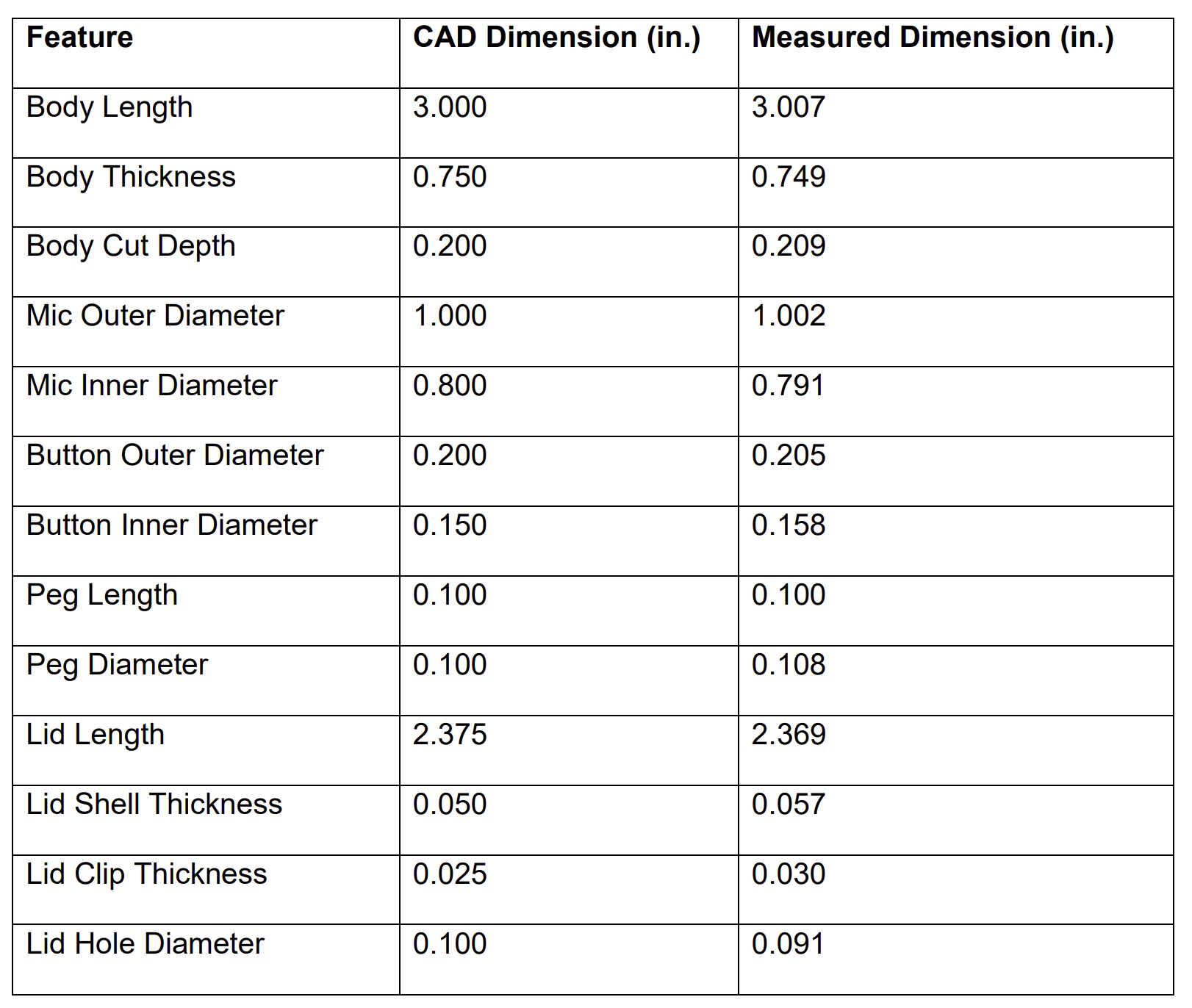 Comparing the measured dimensions to the exact dimensions modeled in Solidworks, most were remarkably close. With sometimes no discrepancy between the measured and actual dimension, the difference fell under a hundredth of an inch for every measurement. This surprised me quite a bit. While I knew the Formiga to be a world-class printer, I did not expect such accuracy and precision in the parts, especially at this scale. Additionally, many of the discrepancies can most likely be attributed to measurements with the caliper. Taking a look at the interlocking features, I was unable to measure the inner diameter of the lid clip due to its small size and physical limitations of the caliper. Nevertheless, the tolerances for the peg length and diameter were spot on, falling within just a few thousands of an inch for each component. Overall, the measured dimensions came out much tighter than I expected, leaving me very impressed with the general print quality.